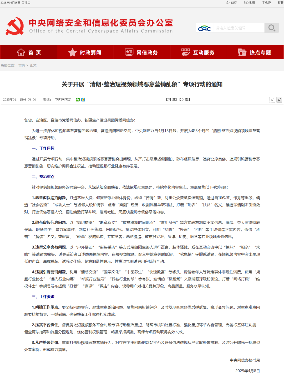 中央网信办自4月15日起,开展为期3个月的“清朗·整治短视频领域恶意营销乱象”专项行动。通过开展专项行动,集中整治短视频领域恶意营销突出问题,从严打击恶意虚假摆拍、散布虚假信息、违背公序良俗、违规引流营销等恶意营销乱象,切实维护网民合法权益,推动短视频行业健康有序发展。